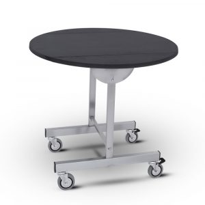 Material : Structure in stainless steel and top in water-repellent MDF wood Wheels : 4 swivel, 2 with brakes Ø 95 mm Dimensions: Ø 800 x H.780 mm