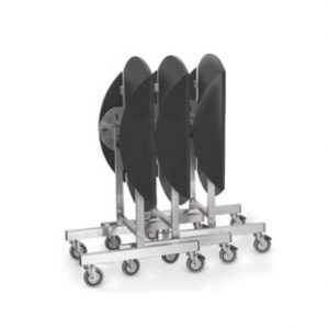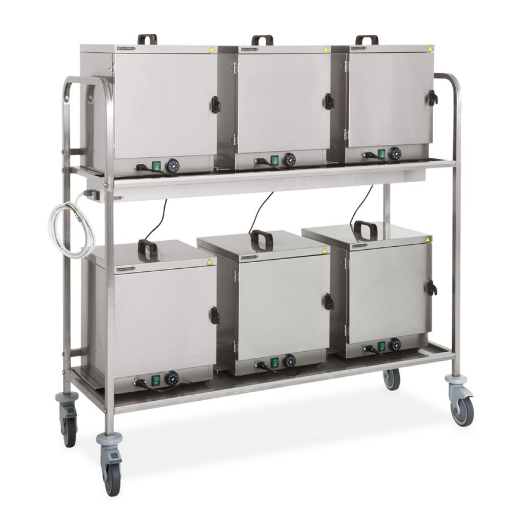 To carry and charge up to 6 hotboxes Material : Stainless steel Power : 6×400 W, 230 V, 50/60 Hz Wheels : 4 swivel, 2 with brakes Ø 125 mm Dimensions : 1530 x 560 x 1390 h mm